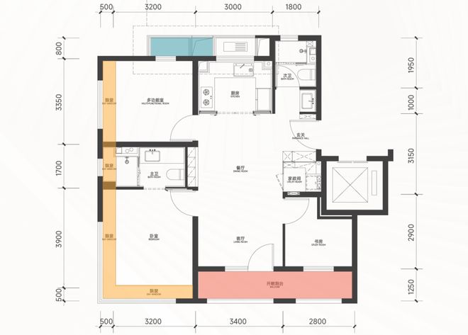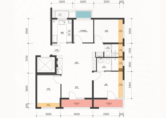 约126平四居,客厅面宽放大至4米,LDK+X空间格局,北侧中央卧室,人口不多,可以两间合并做大套间,也可以做独立兴趣空间,比如电竞房、瑜伽室等。